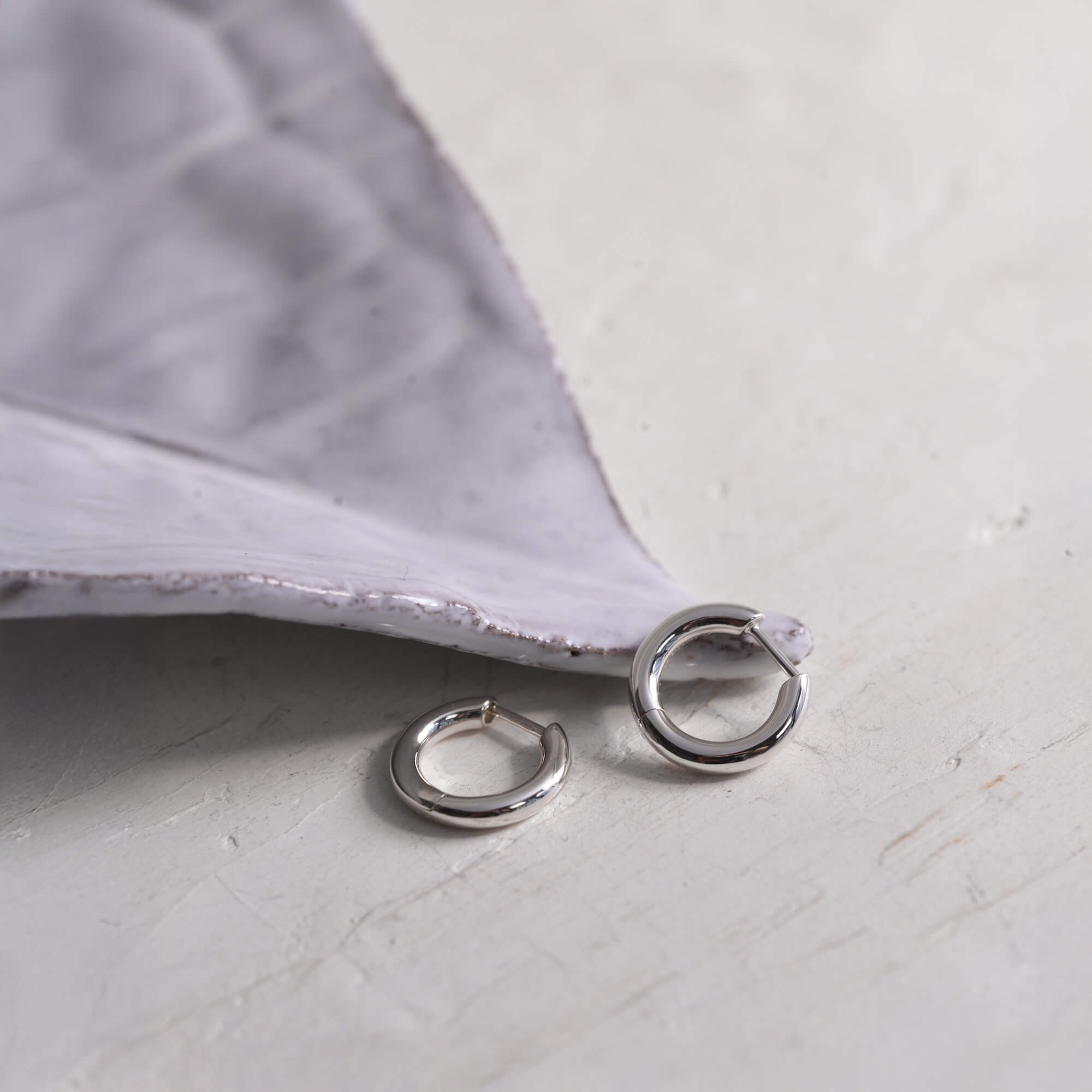 Sterling silver hoop earrings with a simple, classic shape and ease of use. The entire hoop can be opened and closed. This jewelry is both daily use and classic design.