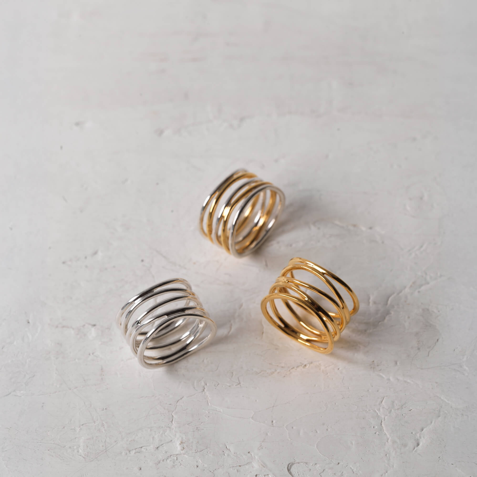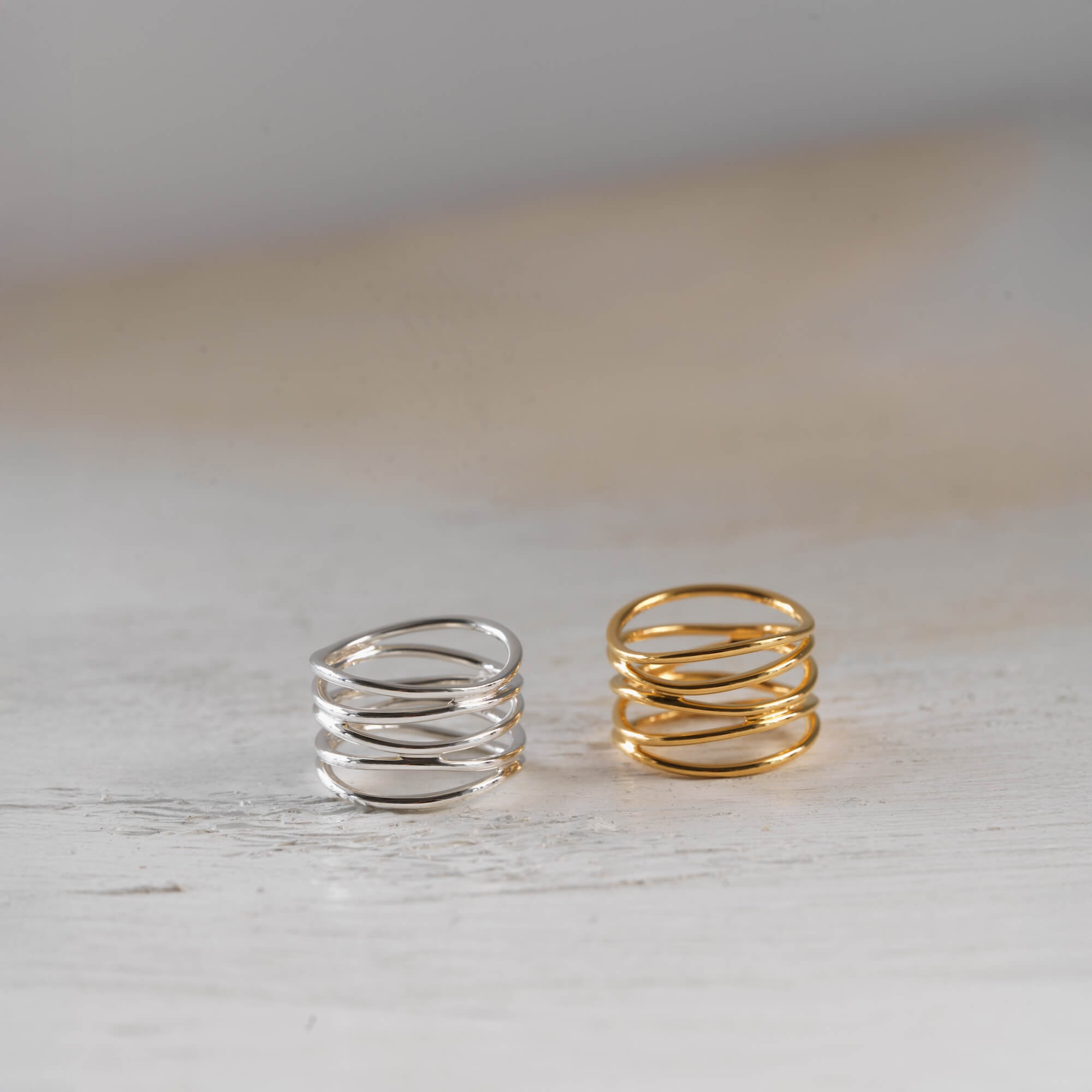 This ring is designed with five lines of sterling silver in a wavy pattern. The curves of the ring are reminiscent of the calm surface of the sea The curves are reminiscent of the calm surface of the sea. The combination of thin curves allows the eye to look through the ring, and it can be styled with other rings that have a larger volume.
