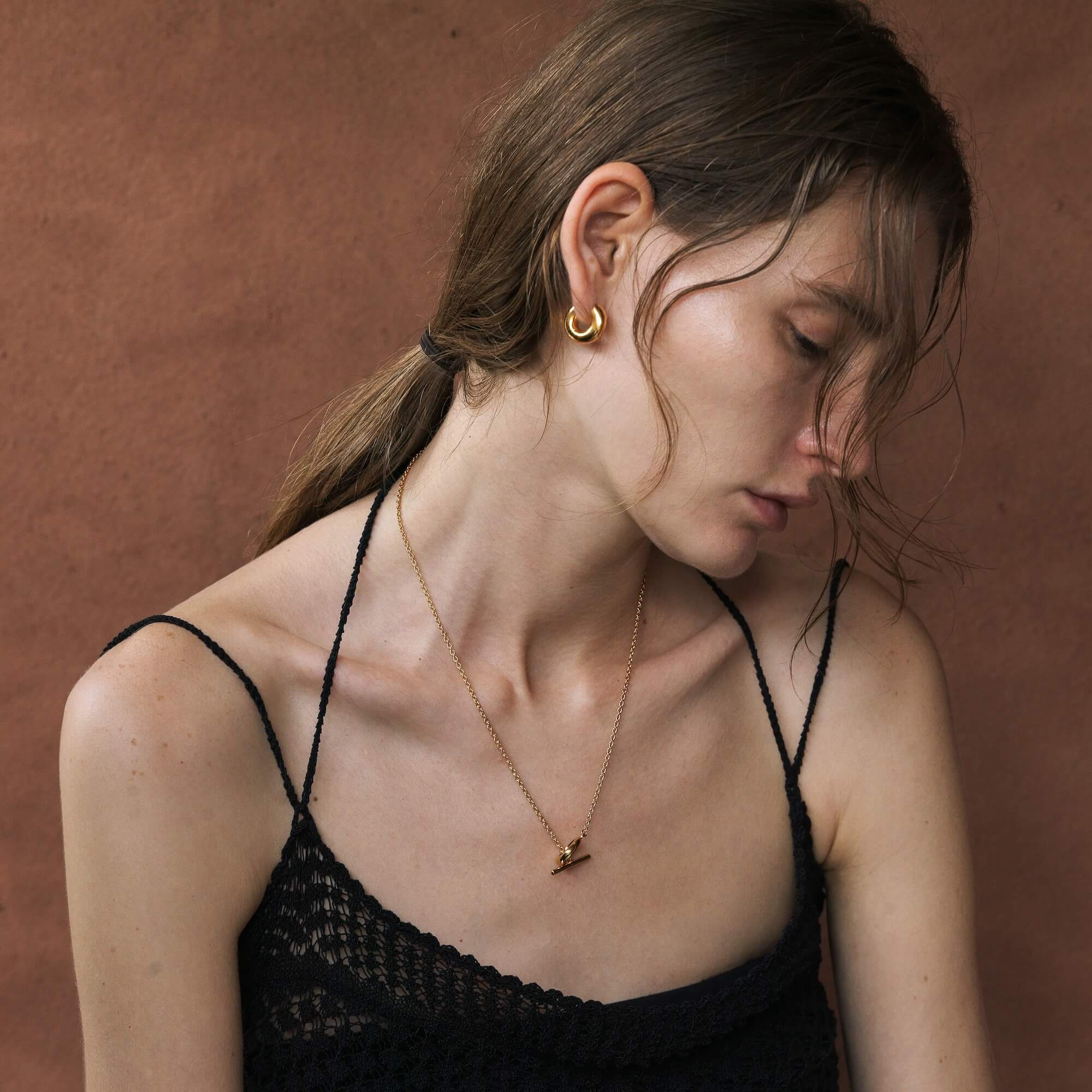 本来は後ろに来る留め具(マンテル)を、美しいオブジェのように昇華させたデザイン。有機的な曲線を描くパーツが胸元でアクセントとなり、シンプルなトップスを一気にモードな印象に変えます。