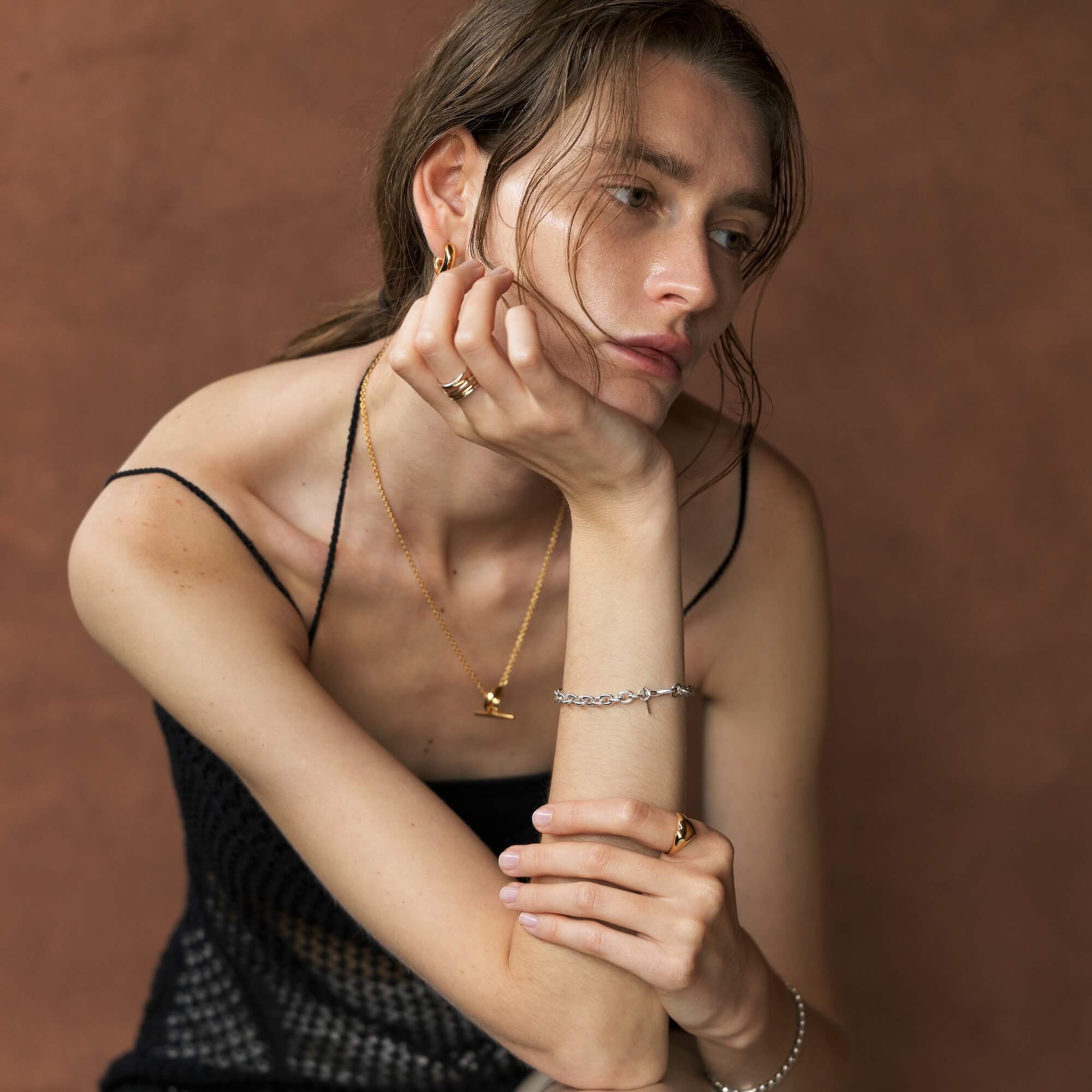 バーをリングに通して留めるだけでなく、チェーンを巻き付けることで長さや形を自由にアレンジ可能。タイトなチョーカー風や、縦ラインを強調するY字スタイルなど、1本で多彩な表情を楽しめます。