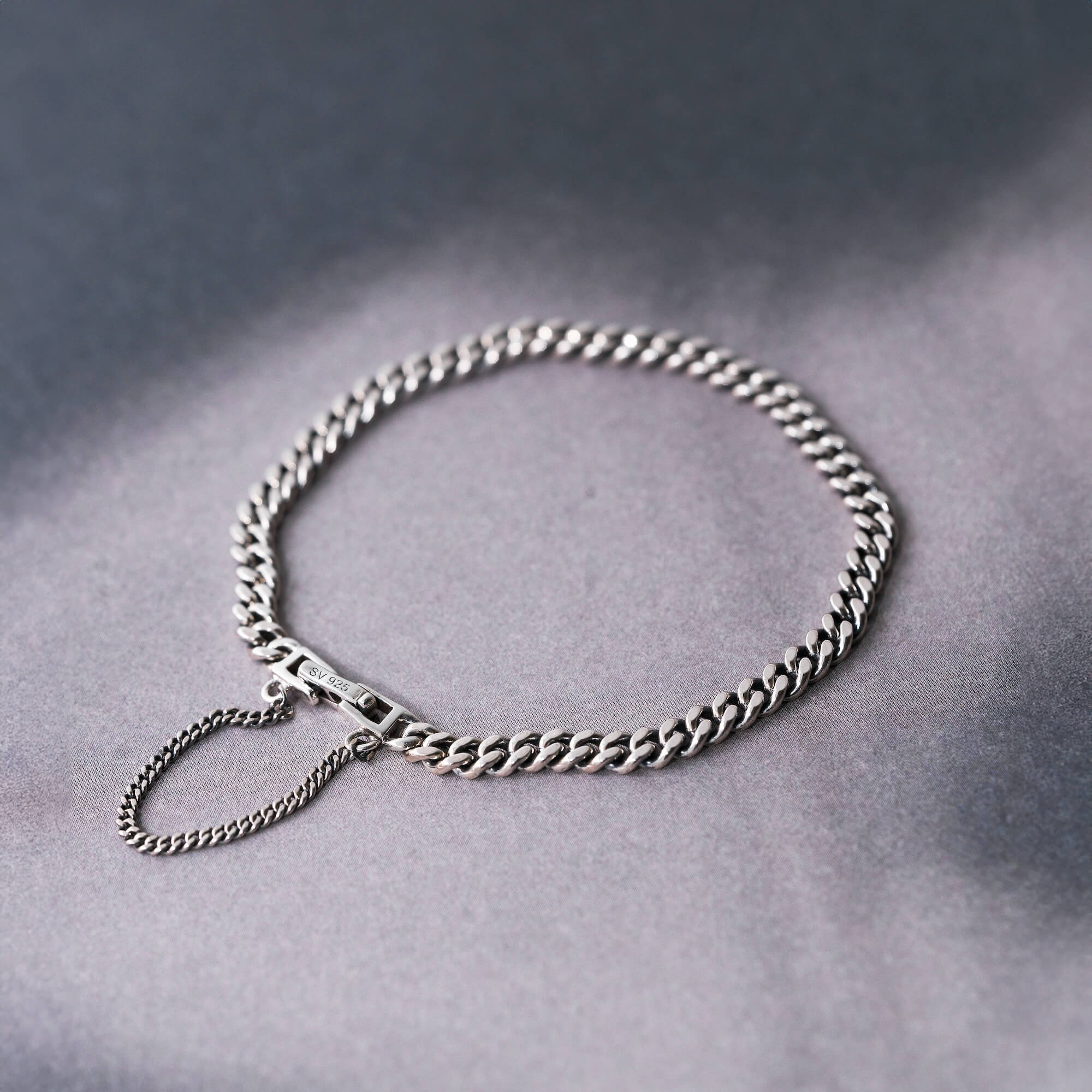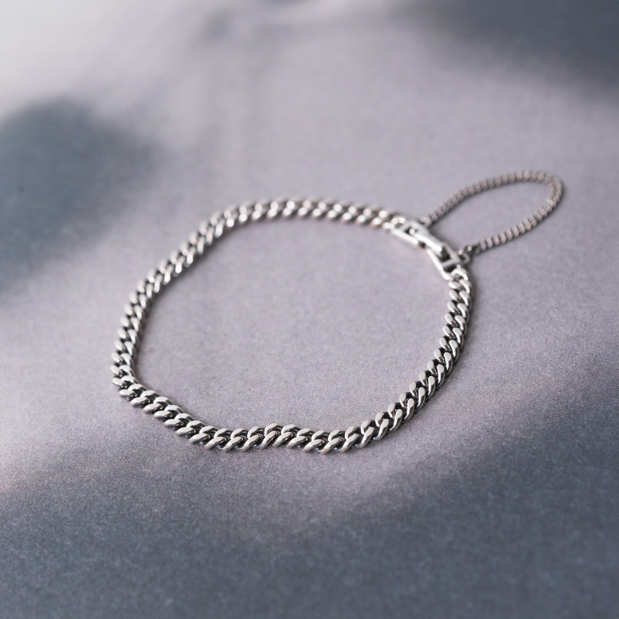 フラットな喜平タイプのシルバーチェーンが連なるヨークチェーンブレスレットは、極細のチェーンと一体化されたような留め具が印象的なミニマルデザイン。チェーン全体にリズムを生み出すような構造美が際立ち、シンプルながら洗練された佇まいを演出します。軽やかな着け心地で、10Kや18Kの繊細なブレスレットとの重ね付けにも好相性。メンズ・レディース問わず自然にフィットする、ユニセックス仕様のブレスレットです。
