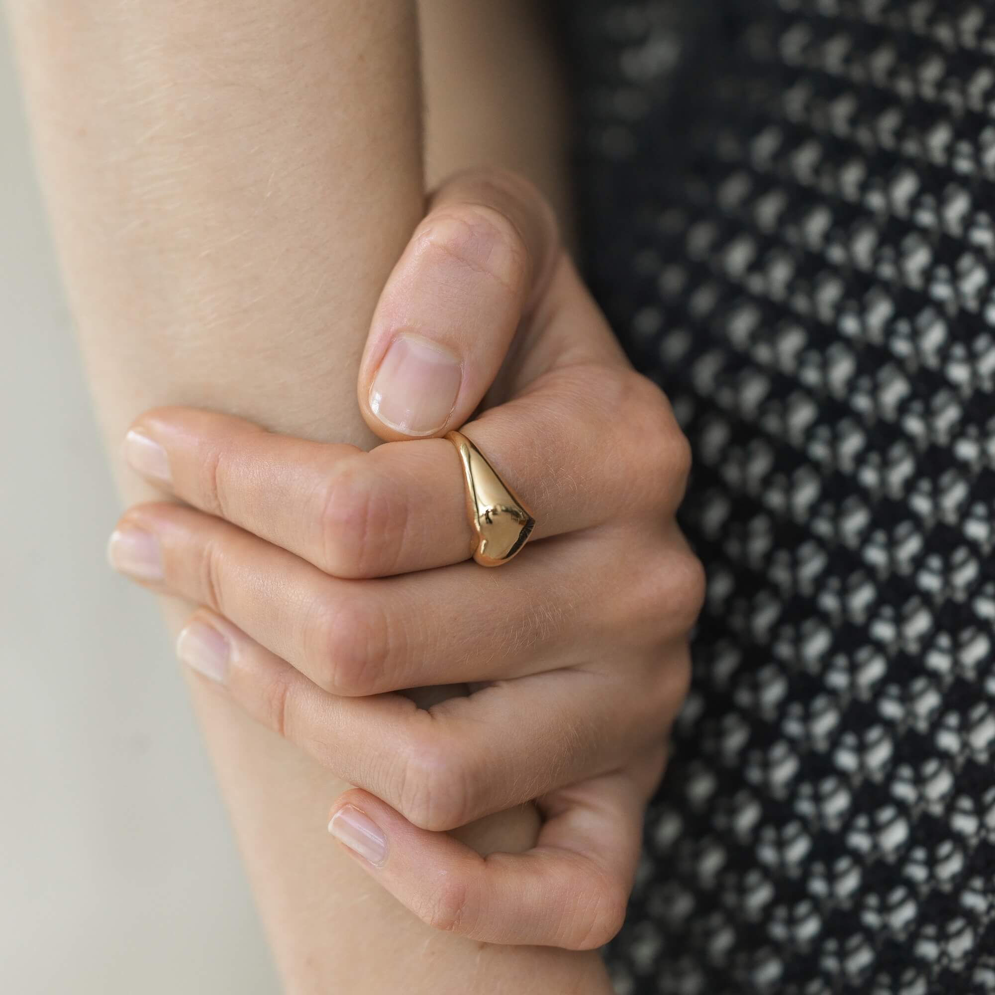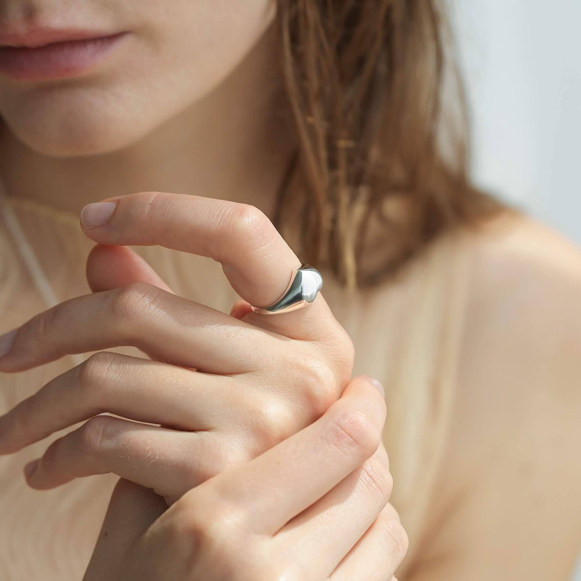 クラシカルなオープンハートのデザインを現代的な感性で再構築し、ミニマルな美しさを際立たせています。リングトップは約10mmと、程よい存在感があります。